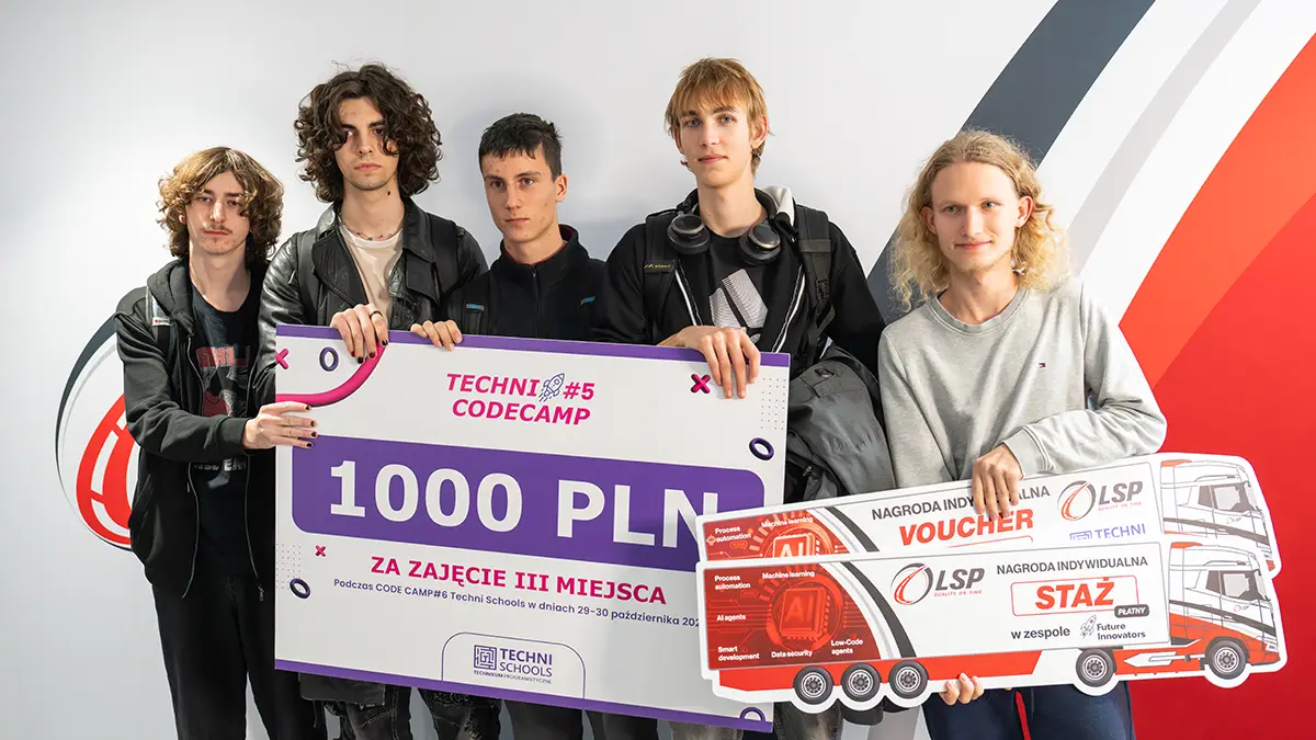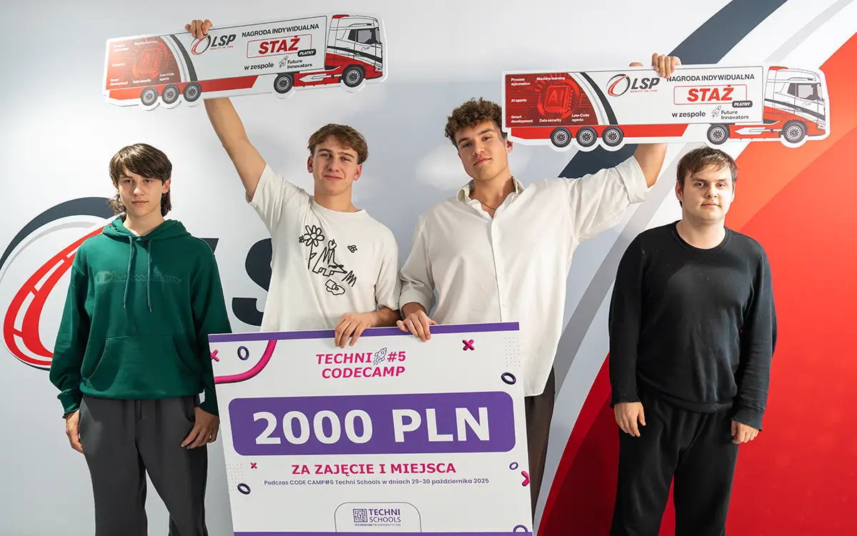 Blisko 90 uczniów w wieku 14–19 lat, 24 godziny hackathonu i ponad 30 godzin pracy w szkole – tak wyglądała 5. edycja Techni Code Camp, której partnerem została LSP Group. Wydarzenie połączyło pasję młodych programistów z realnymi wyzwaniami biznesu. Uczestnicy pracowali w zespołach międzyklasowych, a projekty powstawały od pomysłu, przez kodowanie, po prezentacje przed jury złożonym z 12 ekspertów nowych technologii.